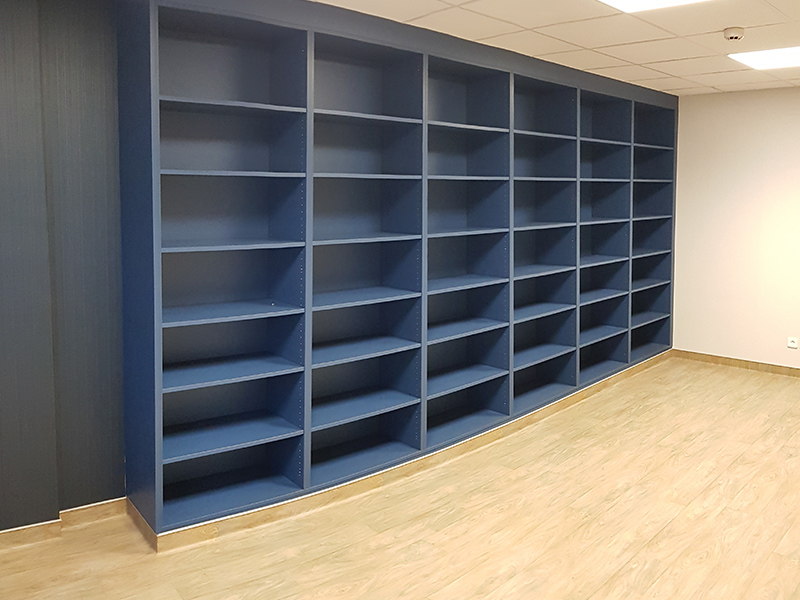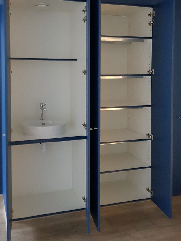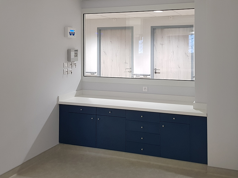 Un bleu cosmique, véritable fil conducteur du centre de santé, se retrouve sur la quasi-totalité du mobilier, et apporte un contraste avec la modernité du bâtiment et ses teintes blanches. Nous le retrouvons dans les vestiaires de la patientèle et du personnel avec de multiples alignements de casiers permettant un rangement optimisé des effets personnels et une sécurité de ces derniers. Plusieurs espaces ont été aménagés que ce soit les archives, les bureaux, les espaces dédiés aux patients ou encore les sanitaires. Les divers rangements, tout en sobriété, accueillent des ensembles de décontamination, des vidoirs et des plans vasques en résine.