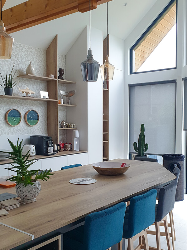 L’îlot central situé au centre, crée une ambiance chaleureuse et offre un espace aéré à la pièce. C’est le meuble déco multifonction de la cuisine, aussi bien pour cuisiner sur le plan de travail et les plaques de cuisson, que pour prendre ses repas. Il offre également plusieurs rangements qui sont discrètement dissimulés sur le côté.