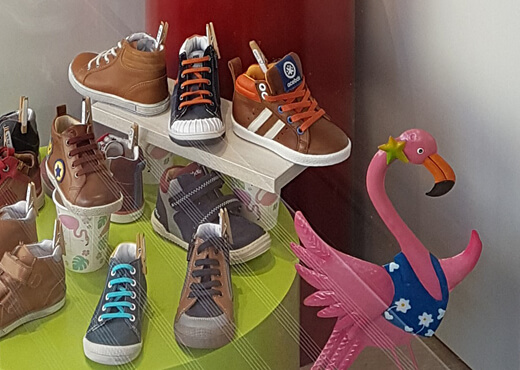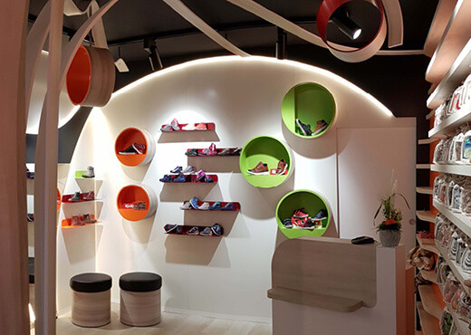 Le cœur du magasin est occupé par une sculpture-arbre monumentale, véritable pièce maîtresse de l’agencement. Réalisé en bois thermoformé, il s’élance du sol jusqu’au plafond, ses lames s’enroulant avec élégance pour créer une impression de mouvement. Autour de ce tronc central, une banquette circulaire permet aux enfants et à leurs parents de s’installer confortablement pour essayer les chaussures.