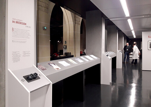 Certains mobiliers, positionnés à hauteur de main, intègrent des écrans rétroéclairés favorisant l’interaction et l’immersion des visiteurs. Enfin, un socle spécifique en bois, dont la forme en demi-cercle vient prolonger le sol, a été conçu pour surélever et mettre en valeur une œuvre, soulignant ainsi son importance dans le parcours scénographique.