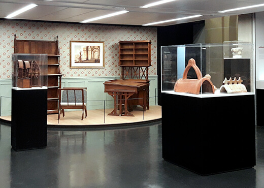 Techniques utilisées : meubles et présentoirs sur mesure pour exposition.
